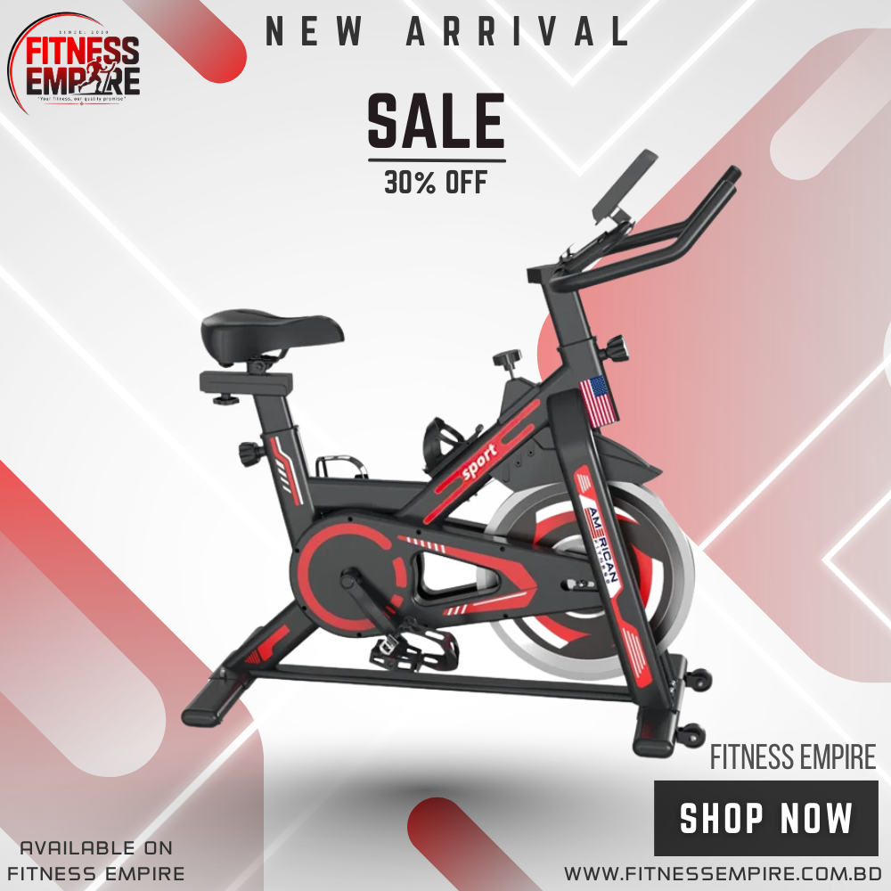 The AMERICAN FITNESS AF-10 Spinning Bike (also marketed as American Sport or similar branding in the promo image) is a compact, home-friendly indoor cycling/spinning bike designed for intense cardio workouts, HIIT sessions, calorie burning, and endurance training. It features a sleek black frame with red accents, a large flywheel, adjustable handlebars and seat, and a sturdy base — ideal for simulating outdoor road or studio spin classes right at home in Dhaka.